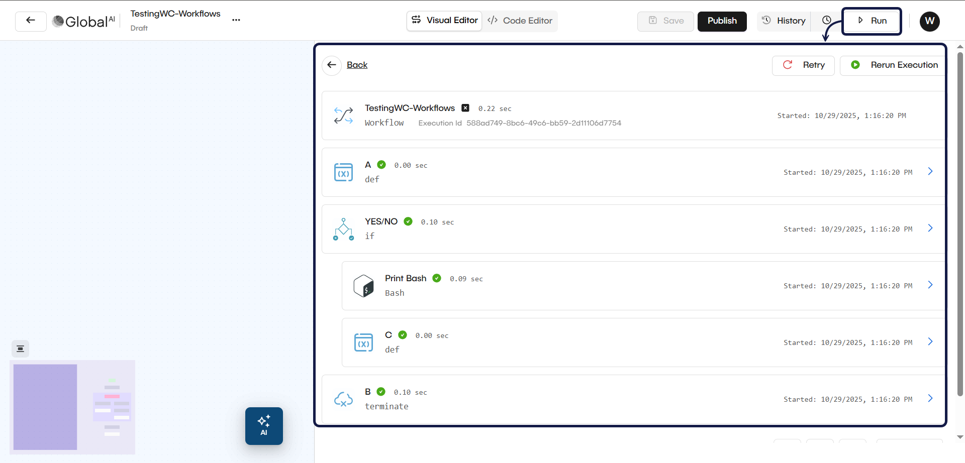 The Workflow editor is the visual canvas where you design and execute automated sequences of tasks. In GlobalAI, every workflow resides within a Workspace, which provides the structured environment and resources needed to orchestrate your automation.