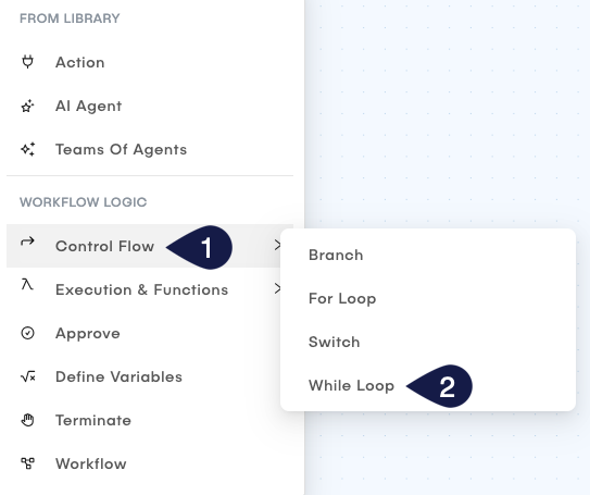 After adding the While control flow node, you will have a single output node that you can connect to other nodes in your workflow to run for each iteration. For defining the flow, follow these steps: