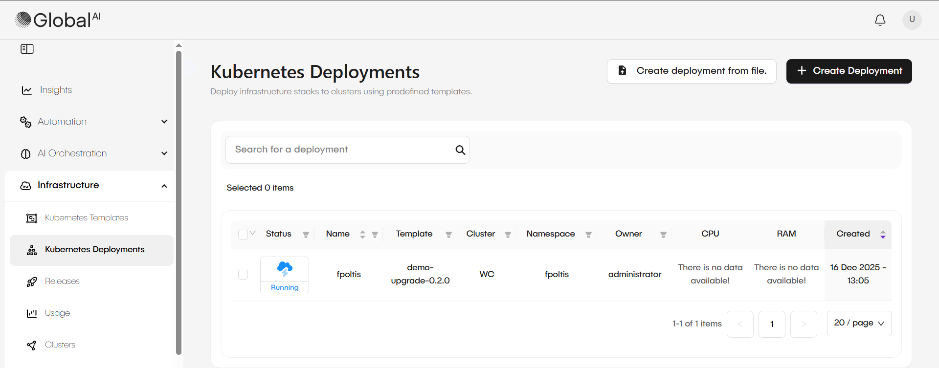 To check the current state of your deployments, navigate to the Kubernetes Deployments menu. The platform displays a list of all active deployments along with their real-time status.