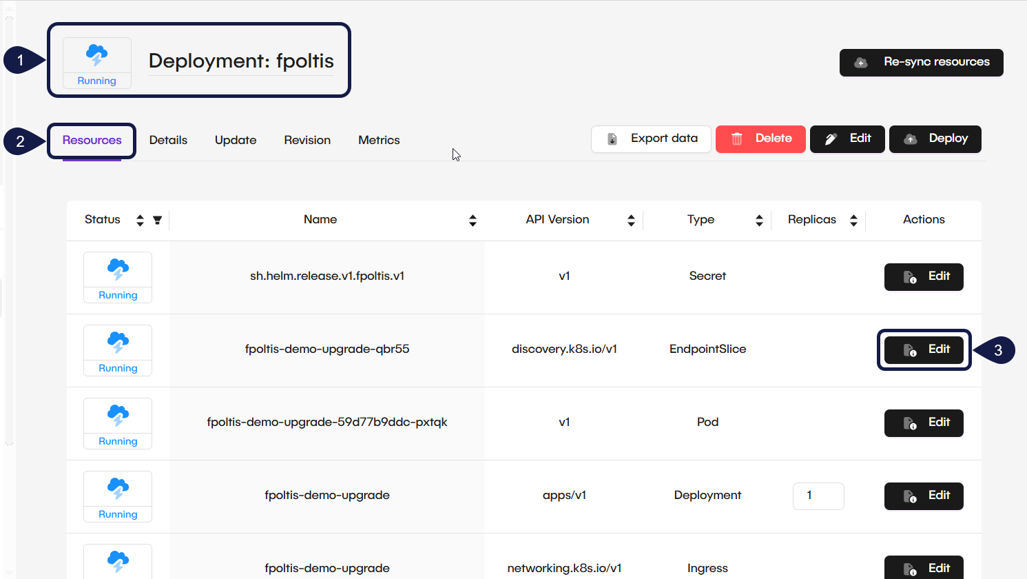 - Click Edit next to any specific resource (such as a pod or service) to view its manifest. The manifest is updated live from the Kubernetes cluster, providing the most recent status and configuration details.