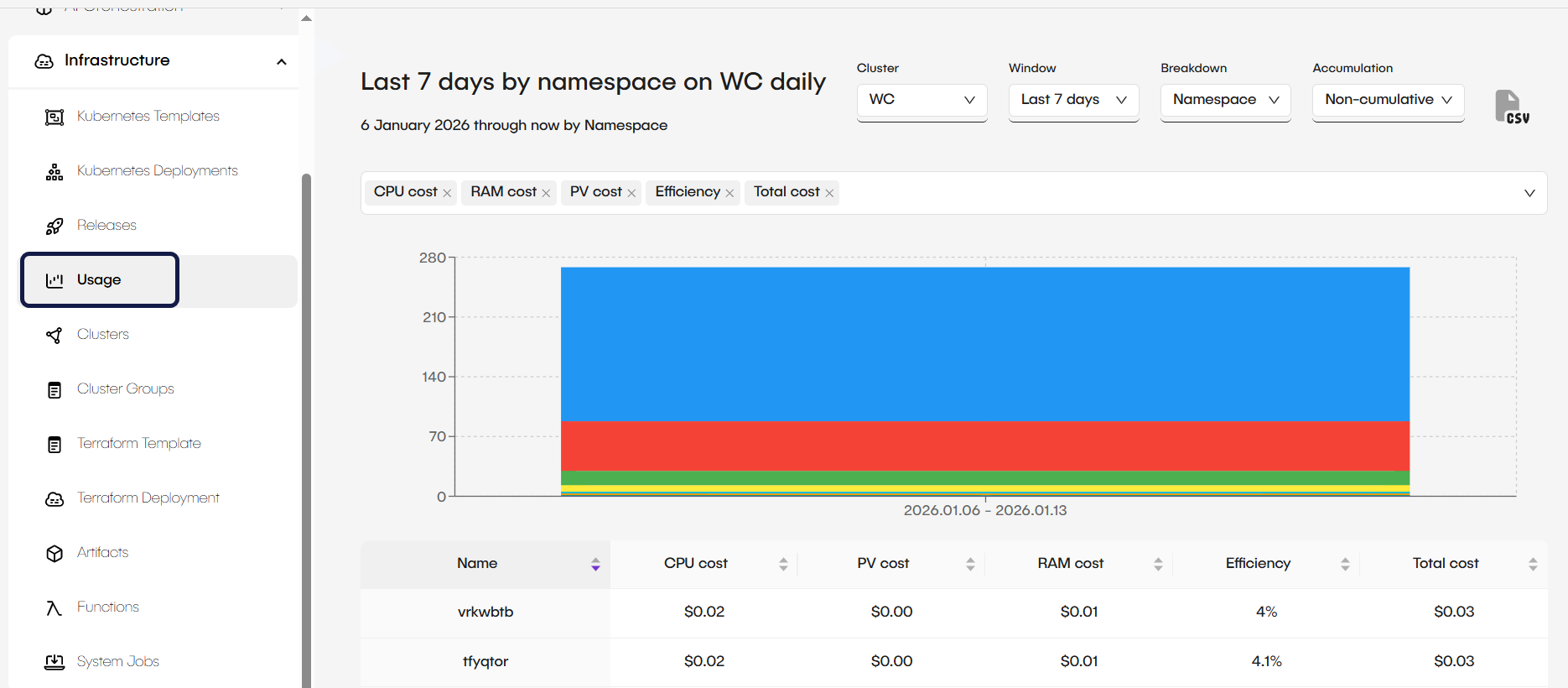 - Track Cost Types: View specific breakdowns for CPU cost, RAM cost, and PV (Persistent Volume) cost, among others.