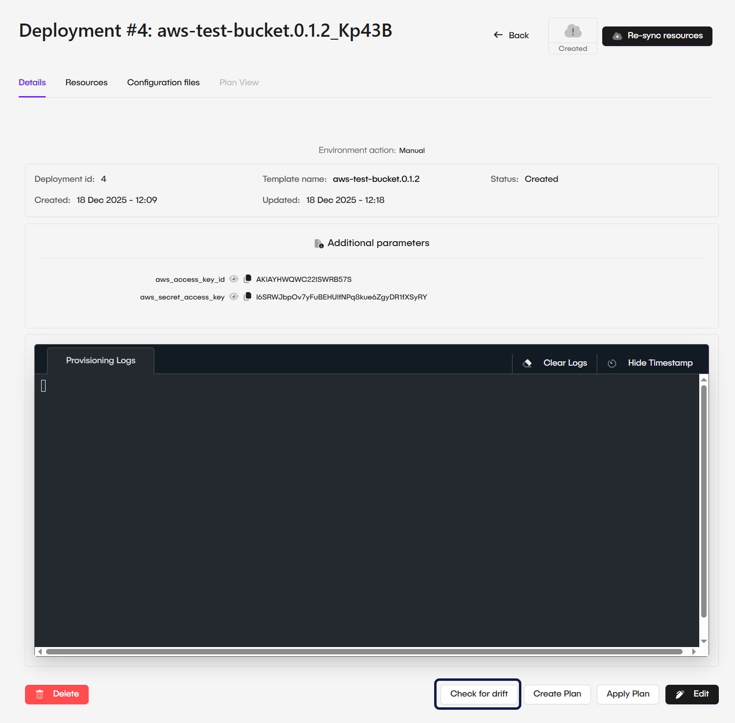 - Deploy & Plan: Generates a Terraform execution plan without making changes. Use this to preview exactly which resources will be created, modified, or removed in the Details console logs.